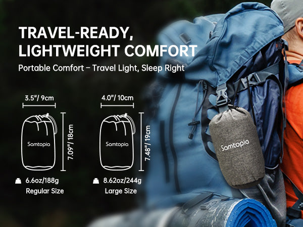 Packs down to soda-can size and weighs just a few ounces, making the blow-up pillow perfect for camping, hiking, backpacking, or travel. Experience the comfort of home anywhere. Available in two sizes to suit your comfort preference.